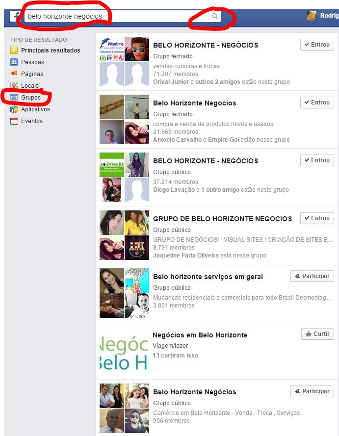 O segundo passo, já logado no Facebook é você fazer parte de grupos que tenha alguma relação com seu negócio e ou grupos do tipo "anuncie aqui" e até mesmo grupos em que você acredita que suas postagens podem ter algum efeito para conquista de novos clientes/publico.
